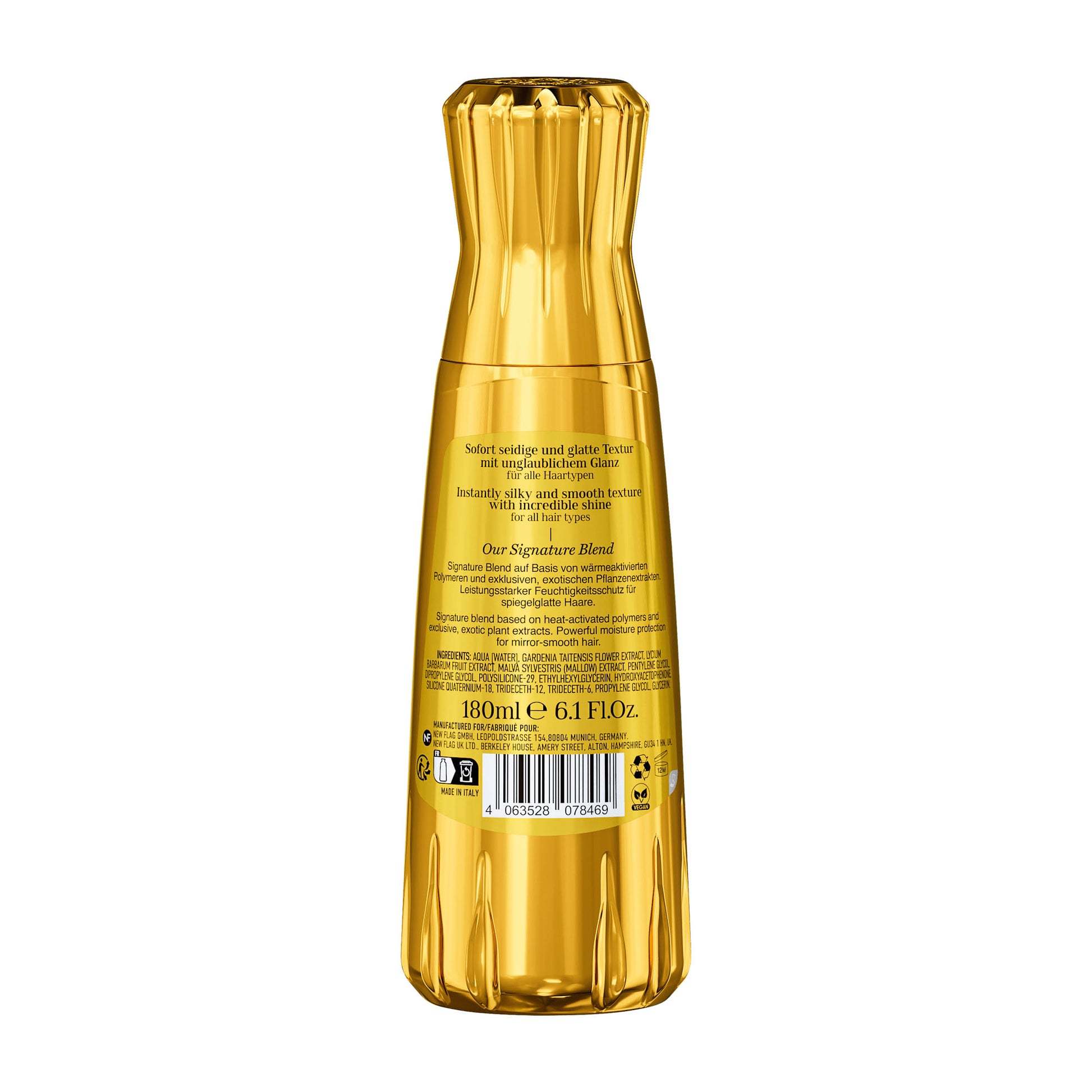 Divide towel-dried hair into sections. Spray generously and evenly onto the hair. Blow-dry each section under heat and tension to activate the powerful moisture protection for mirror-smooth hair and achieve the best results.